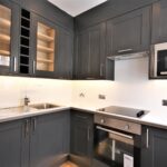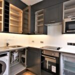 Bespoke fitted kitchen with integrated fridge/freezer, washing machine, beautiful stainless steel sink and bowl drainer with mixer tap, inset induction hob, extractor over and oven beneath. Modern delicate contrasting kitchen units with a white gloss worktop finish.