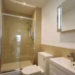 Modern white shower suite with shower attachment, wc, hand wash basin, storage beneath, heater towel rail, extractor fan and light mirrored cabinet.