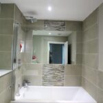 White bathroom suit with corner shower, low level push wc, hand wash basin with storage beneath, part tiles floor and wall. LED spotlights.