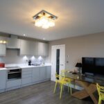 Open plan living room kitchen with low and high level units, work top surface, integrated fridge freezer, washer dryer, LED ceiling down lights, windows, hardwood underfloor heating