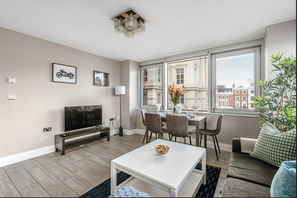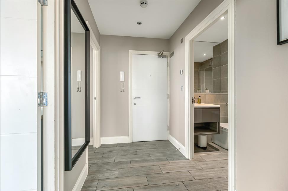 Living room area: intercom door entry system, hardwood flooring, TV aerial point, northly aspect double glazed windows looking out to Bartholomew Square.