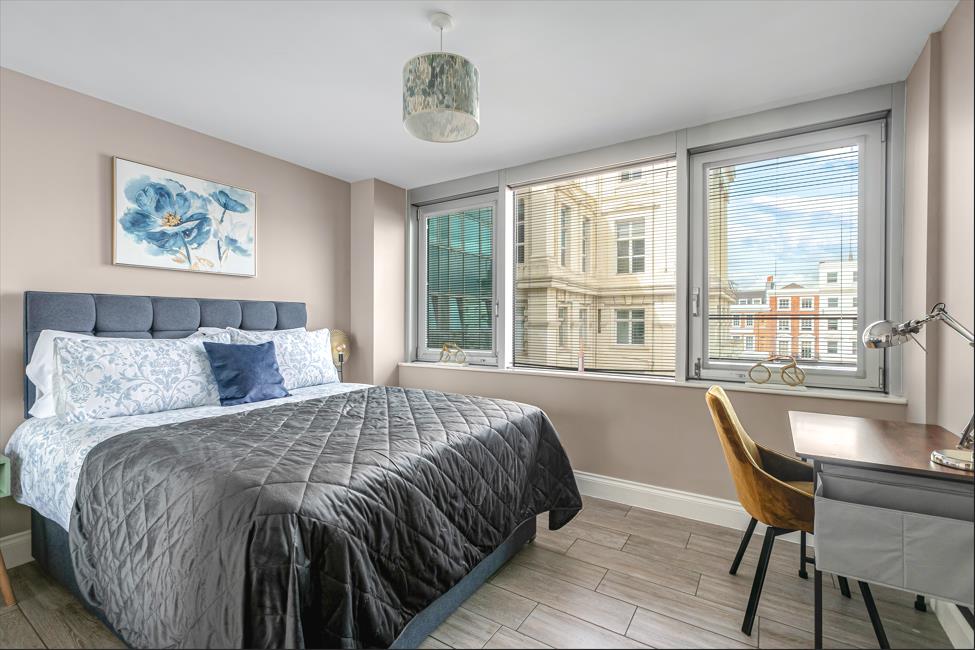 Double bedroom, LED spotlights, hardwood underfloor heating, windows.