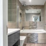 White bathroom suit with shower attachment, low level push wc, hand wash basin with storage beneath, part tiles floor and wall. LED spotlights.