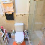 Part tiled floor and wall shower room, corner shower, push button flush w.c, hand wash basin with storage below, heated stainless steel towel rail.