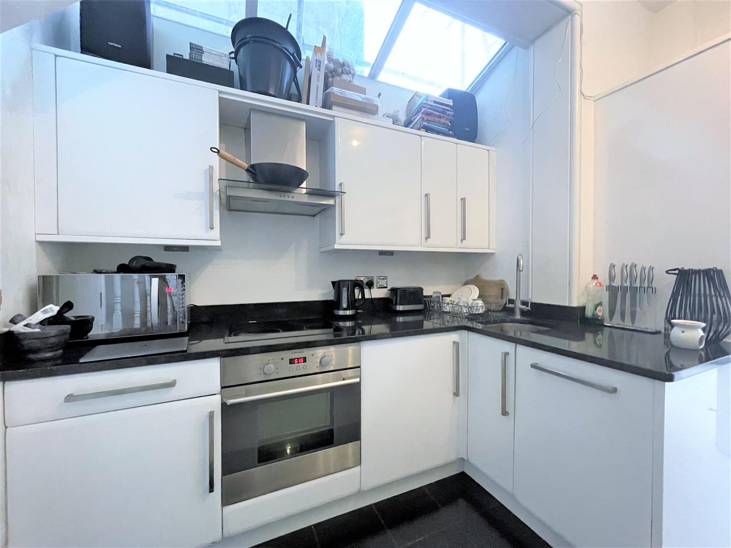 Low and high level white gloss storage units, integrated oven/hob, stainless steel sink and bowl drainer, fridge/freezer, washer/dryer and dishwasher. Solid granite roll work top, ceiling v-lux style window, tiled flooring.