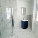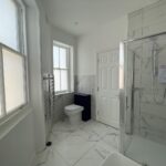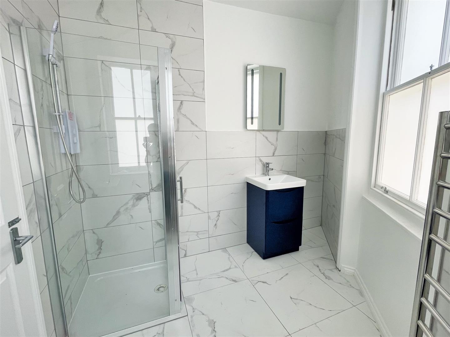 Shower room with marble effect floor and wall tiles, WC, hand wash basin with mixer tap and storage beneath, corner shower with stainless steel shower heads. LED ceiling down lighters.