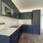 Kitchen area: Navy blue low and high level storage units with gold handles throughout, integrated large fridge/freezer, washing machine, dishwasher, electric oven, hob with extractor fan above and microwave, sink and mixer tap. Marble effect work top and splash back.