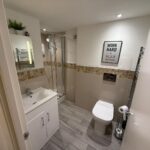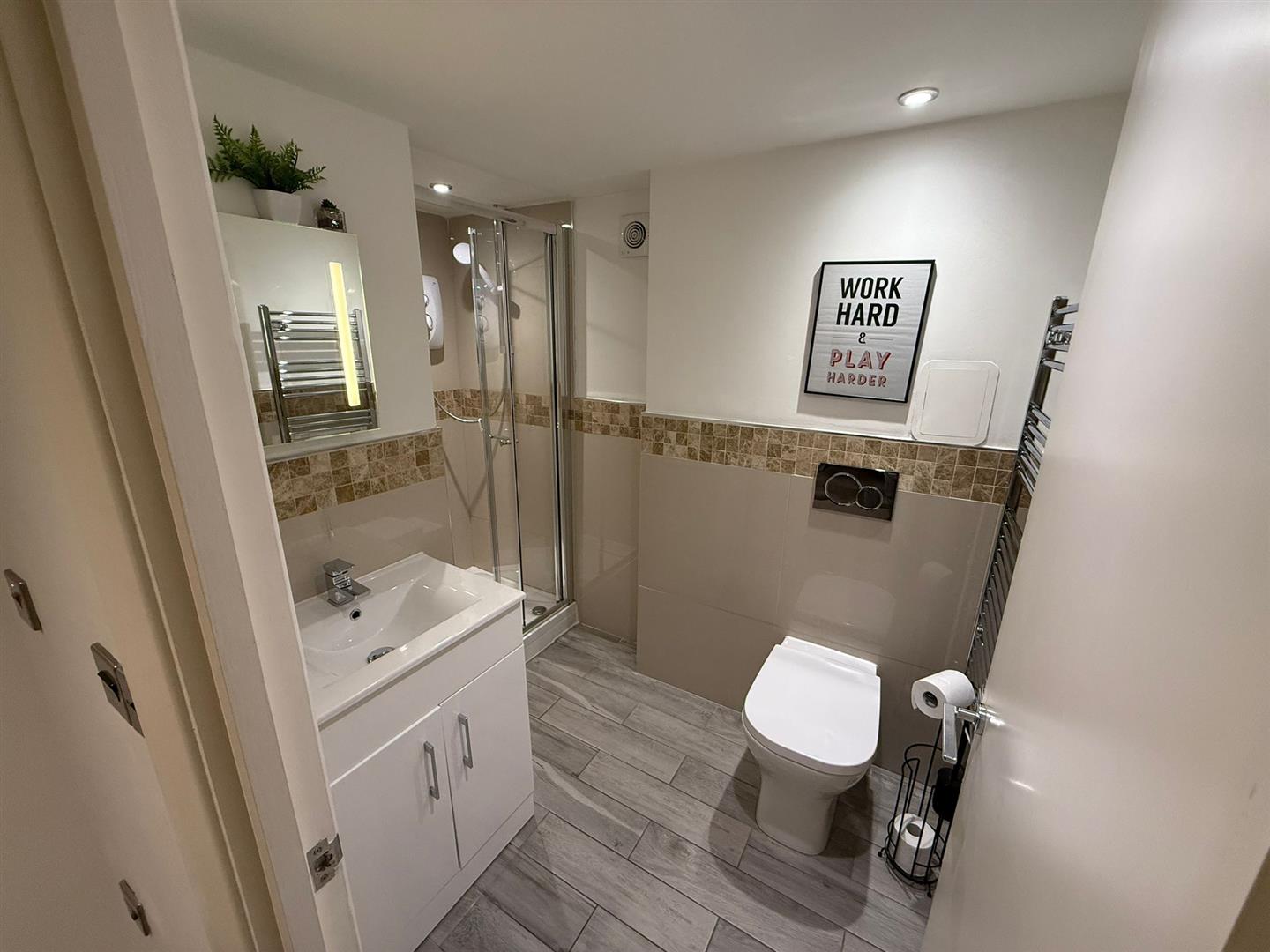 comprising of; corner shower, hand wash basin with storage below, mirror above, low level w.c. with push button flush, part tiled walls and laminate flooring.