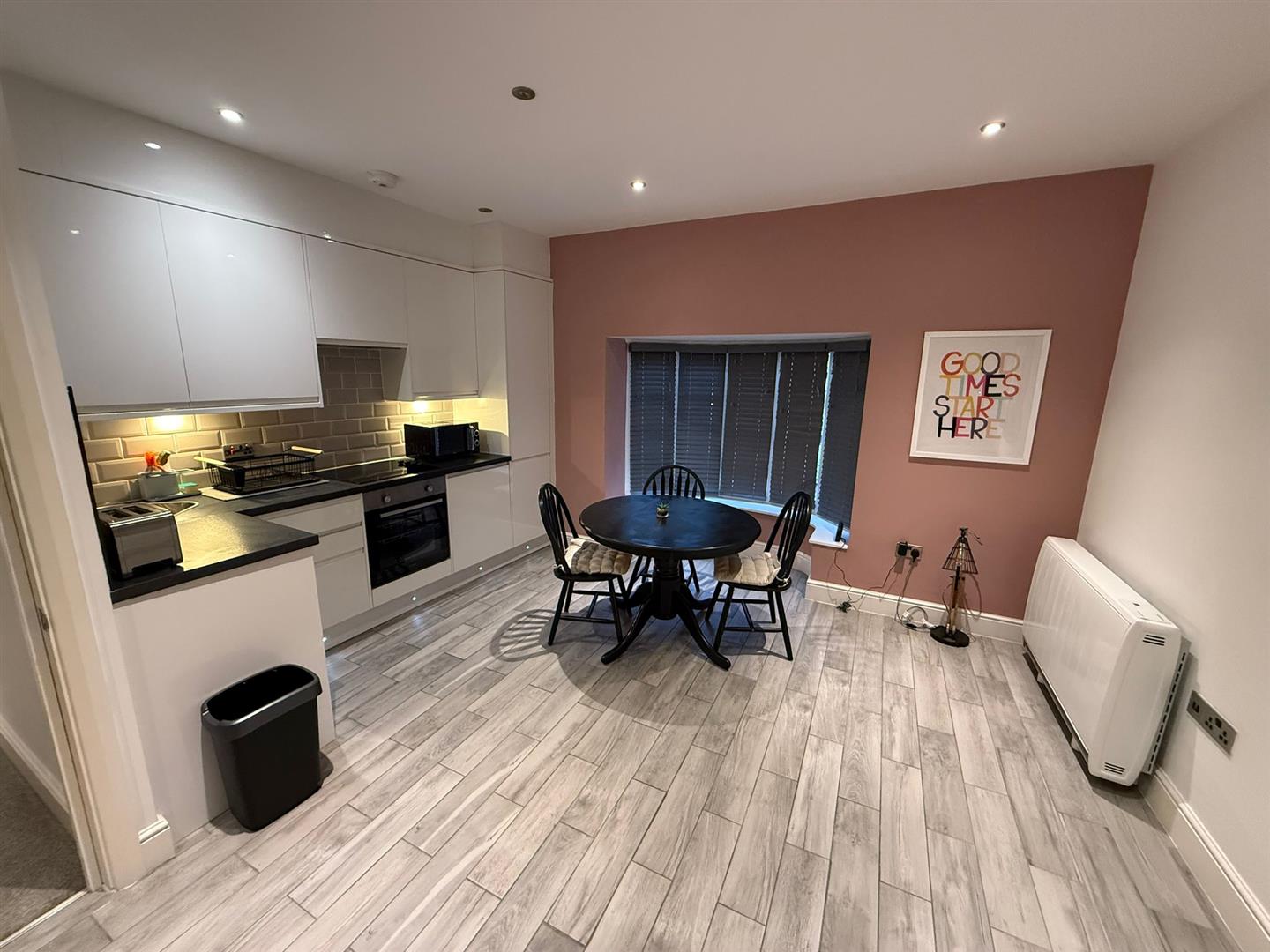 Modern open plan L-shaped living room kitchen with northly aspect bay fronted window comprising of; modern kitchen units, electric hob, oven beneath, extractor fan above, stainless steel sink and drainer, integrated fridge freezer, washer dryer and ceiling down lighters.