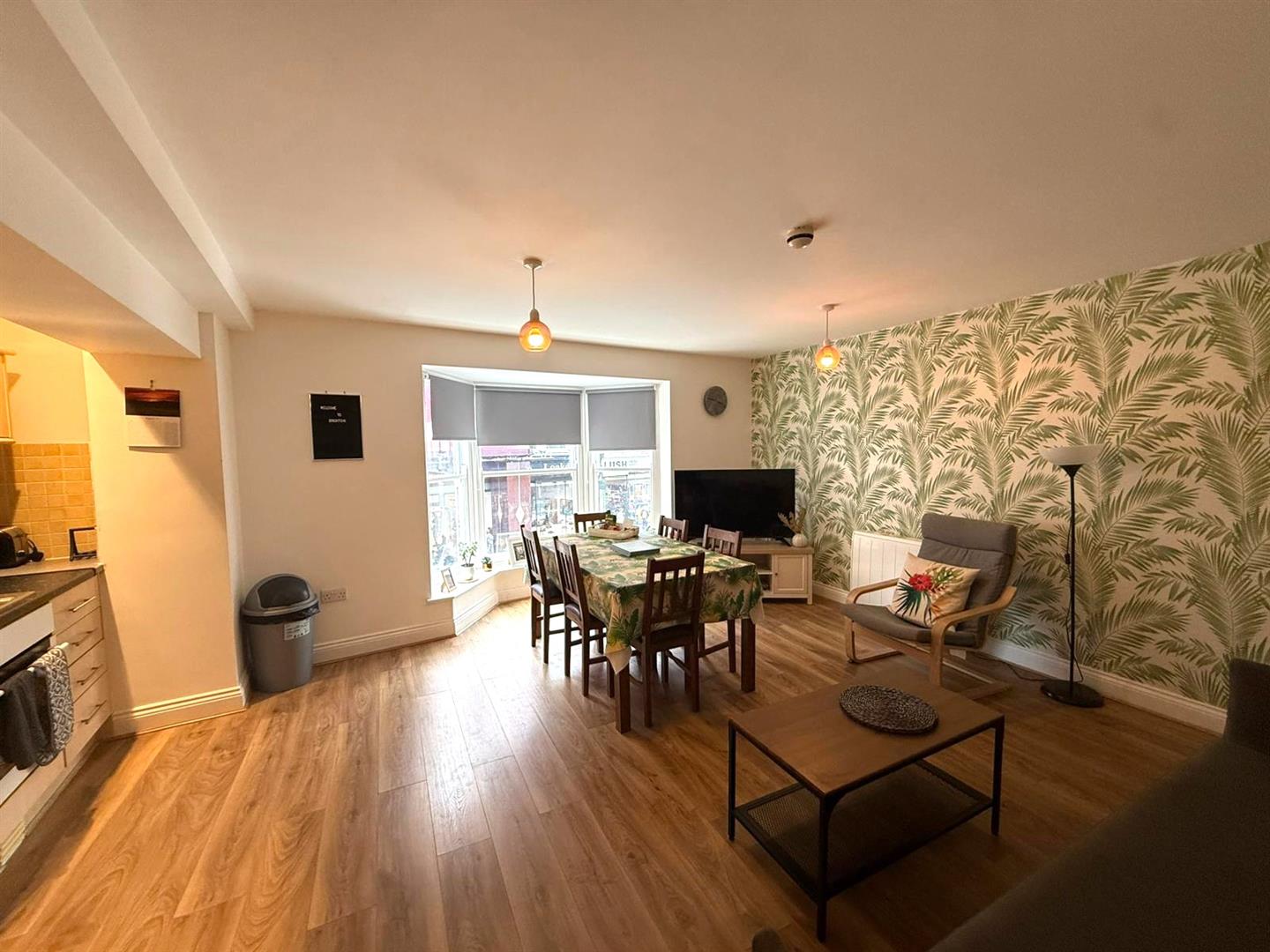 Living area: wood laminate flooring, ceiling down lighters, bay fronted sash window, heaters.