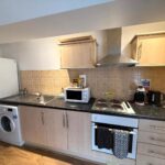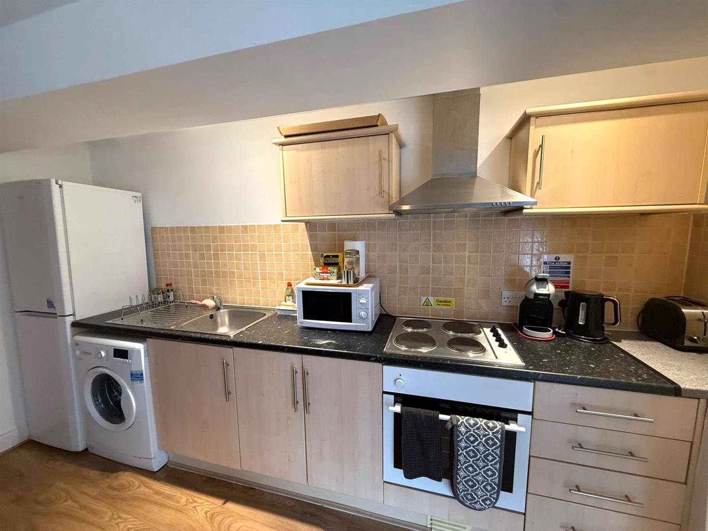 Kitchen area: wood laminate effect low and high level storage units, integrated washing machine, oven and hob with extractor fan above. Free standing fridge/freezer.