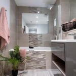 White shower room suit with corner shower, low level push wc, hand wash basin with storage beneath, part tiles floor and wall. LED spotlights.