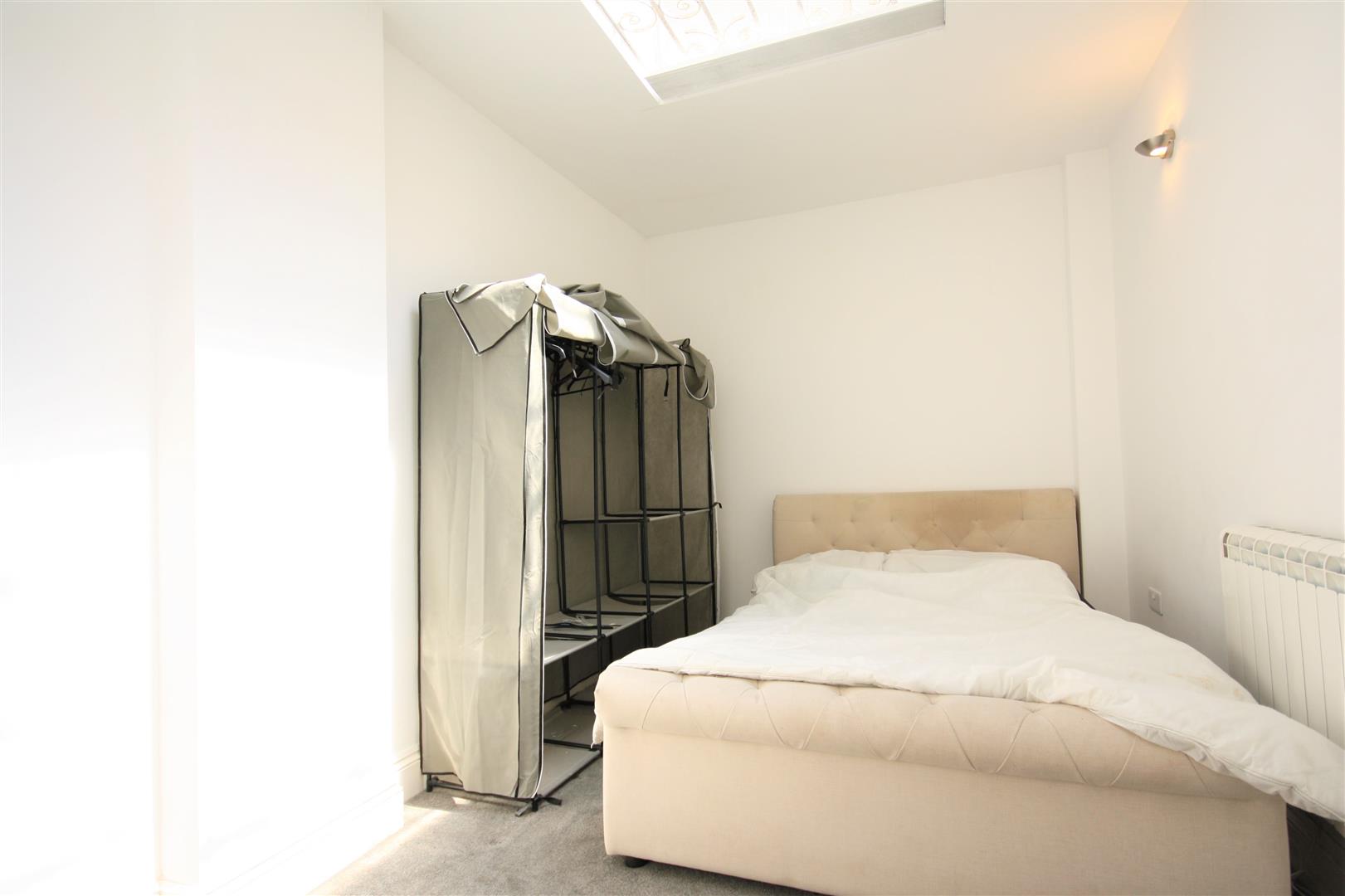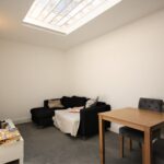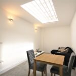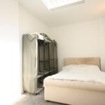 Grey carpet, with electric radiator and sky light. With white walls and high ceiling.
