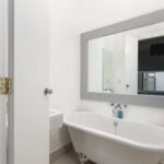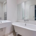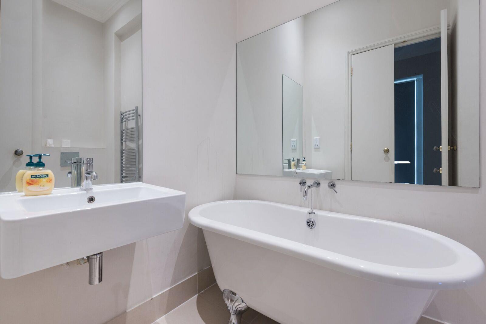 White suite, low level W/C, wash hand basin with stainless steel mixer tap, free standing bath with stainless steel mixer tap, high ceiling, tiled floor, heated towel rail, extractor fan, shaver point and down lighters.