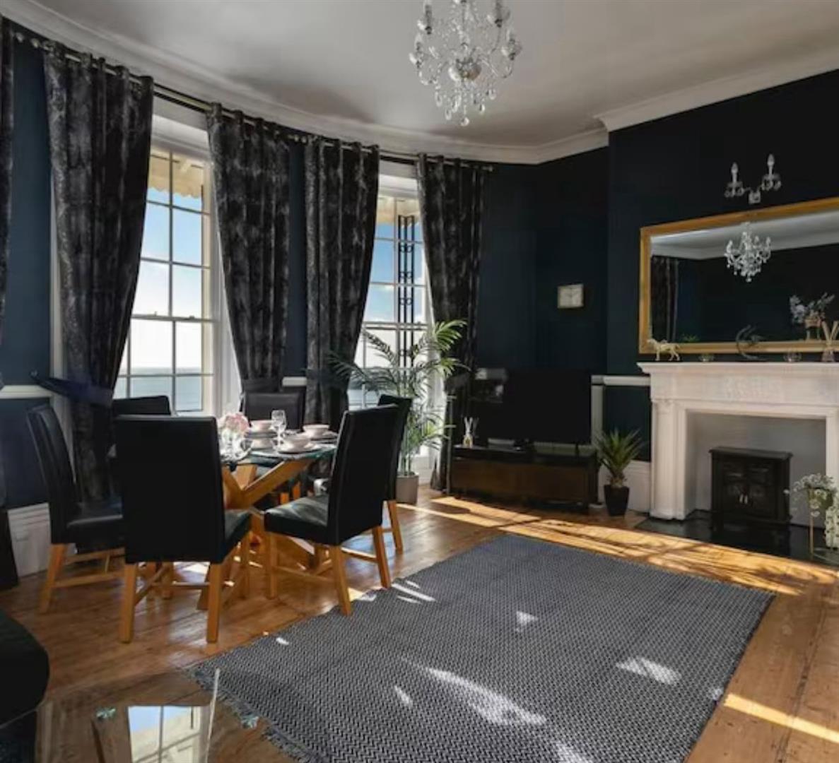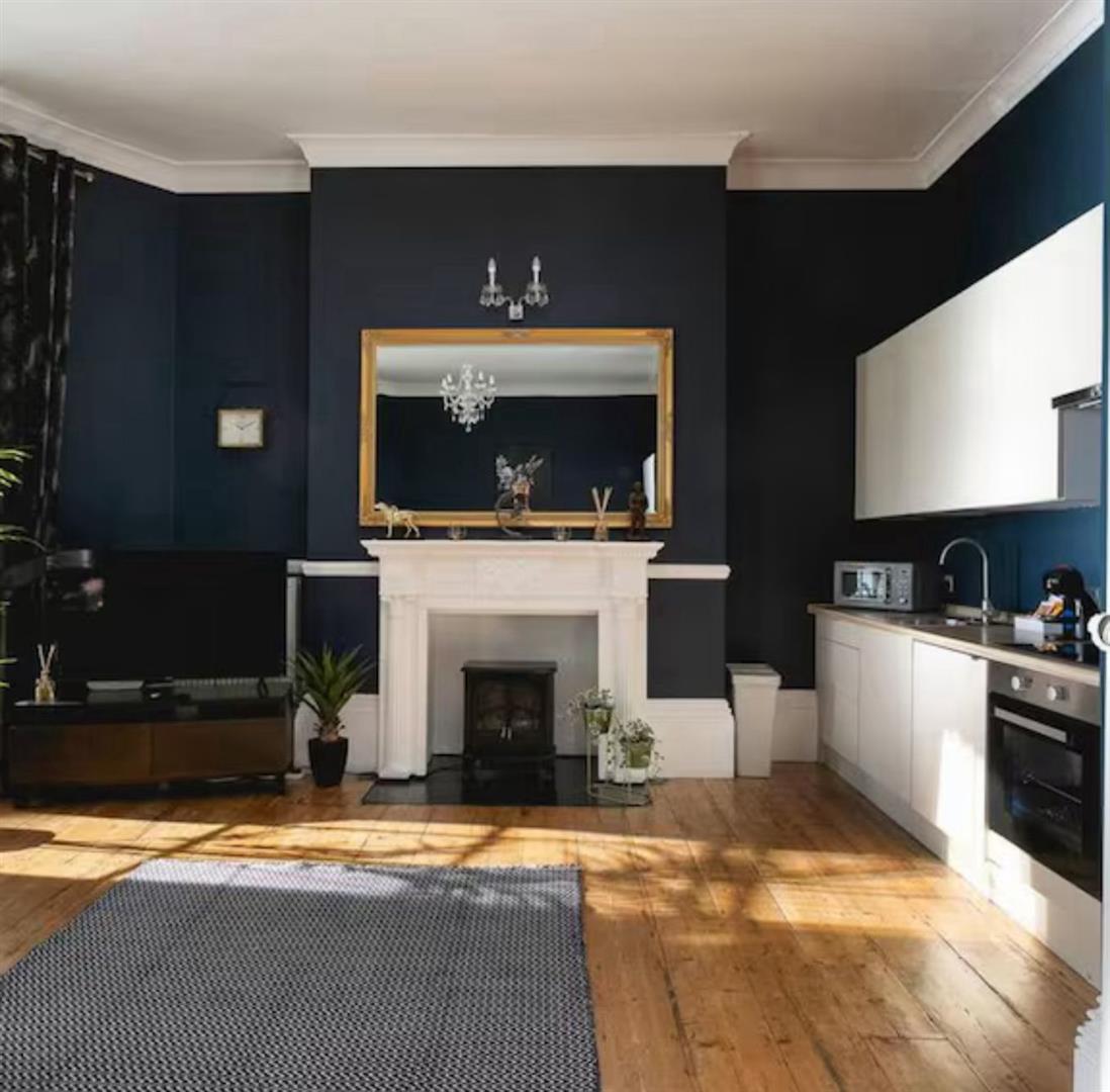 Three stunning floor to ceiling sash windows offering superb widespread sea views, leading to small South facing balcony, original wood flooring, two radiators, attractive fireplace surround, space for dining table. coved ceiling.