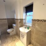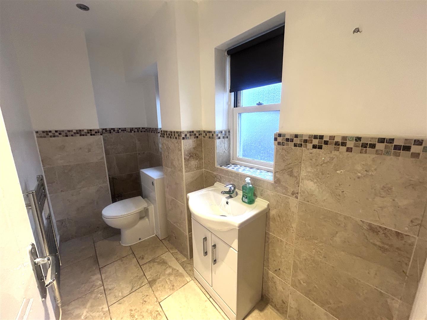 Separate W/C with half tile and half white paint throughout. Consisting of wall mounted towel radiator, hand wash basin with tap and cabinet underneath.