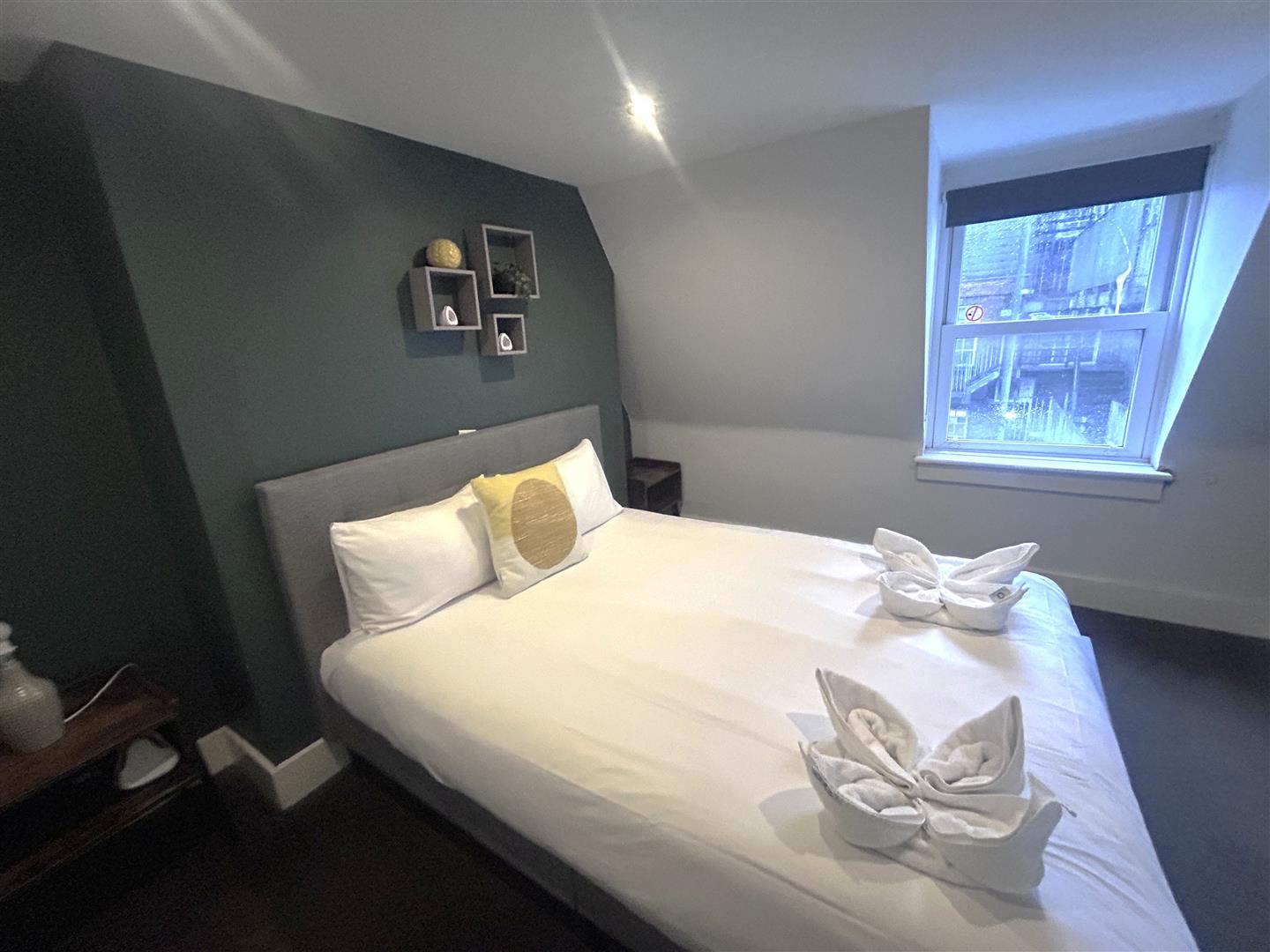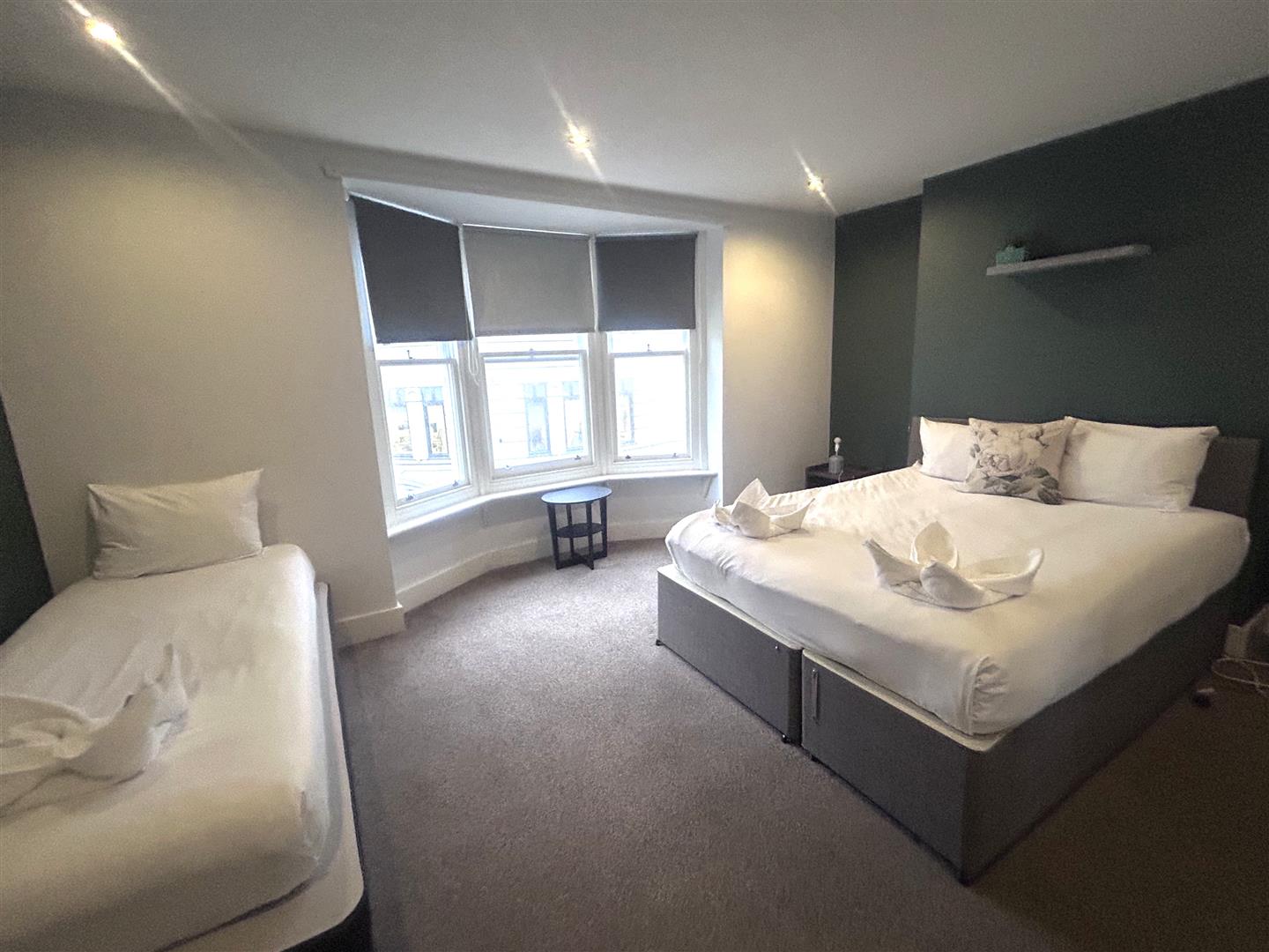 Double bedroom on the top floor of the apartment with easterly aspect bay window, carpet flooring, LED ceiling downlighters, radiator, TV aerial points.