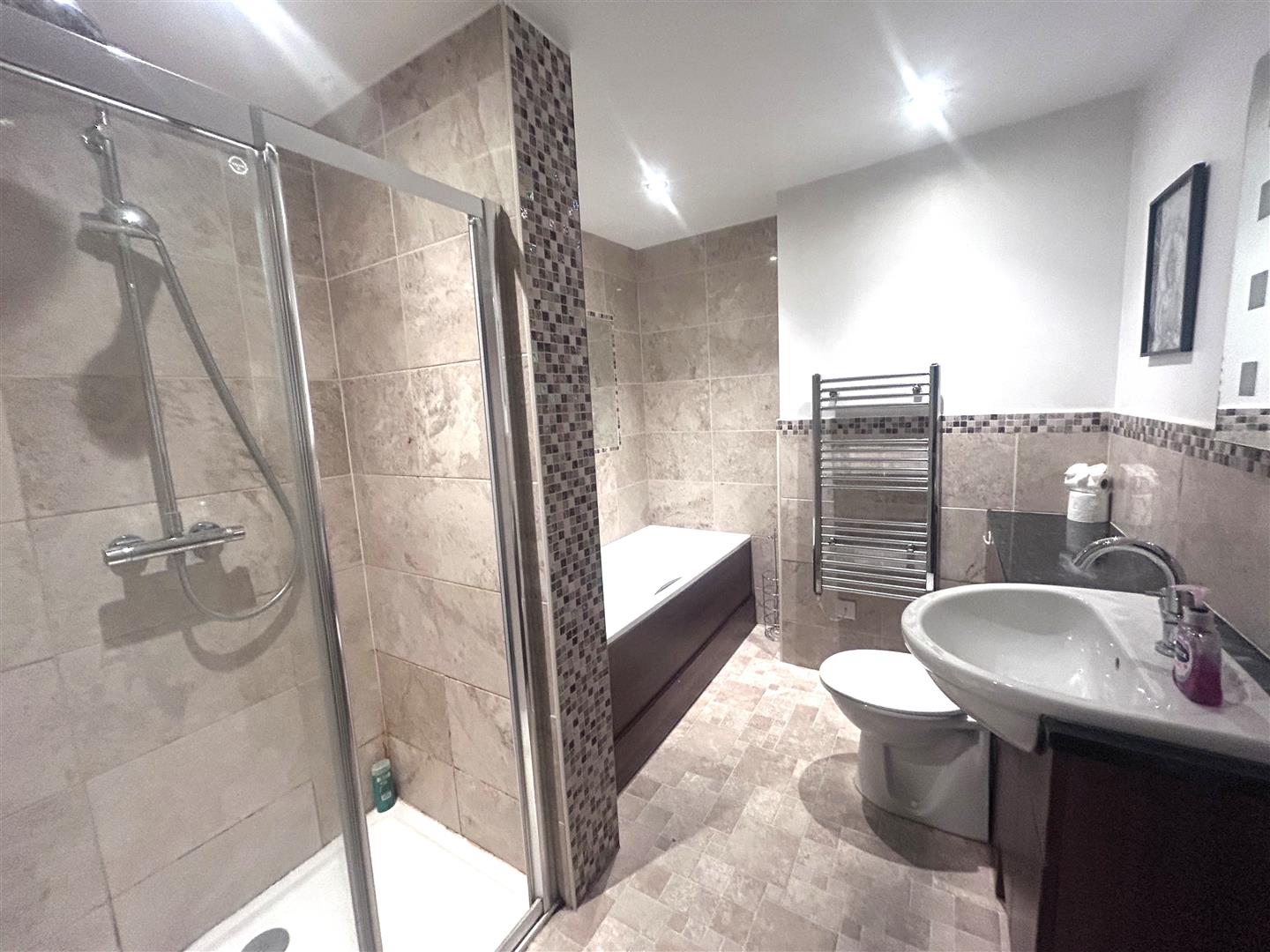 Bathroom consisting of separate corner shower with tiled and paint décor throughout. wooden panel bath, wall mounted towel radiator, W/C, hand wash basin with wooden cabinet underneath. Ceiling downlighters.