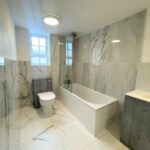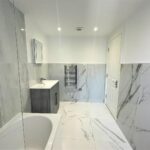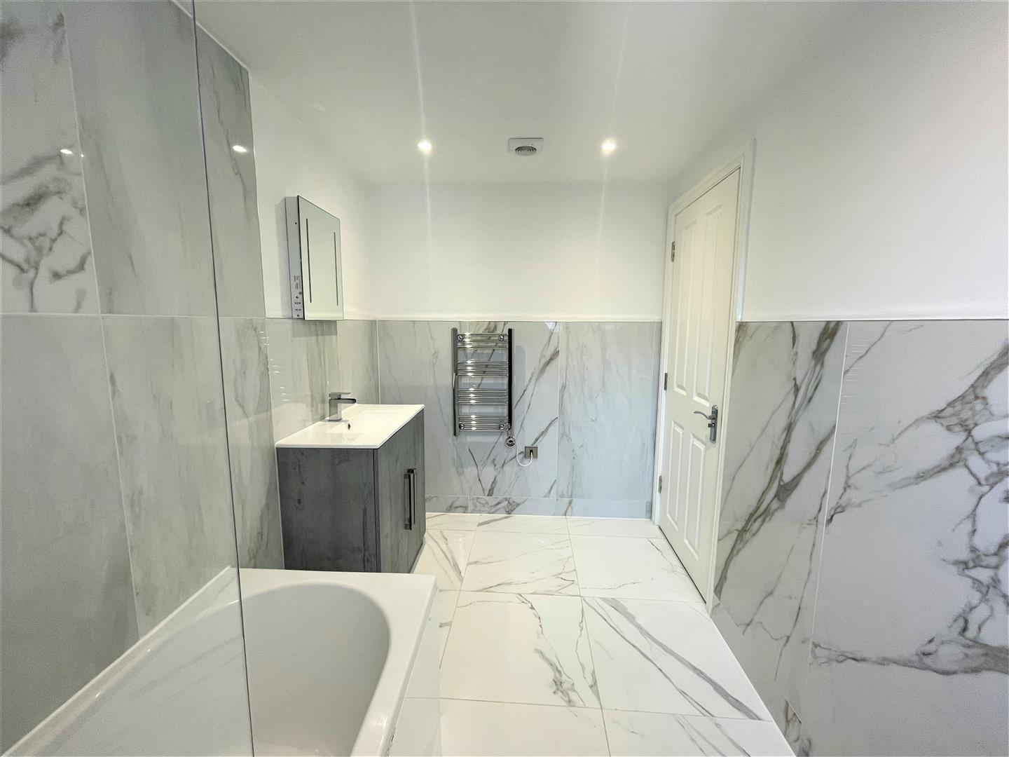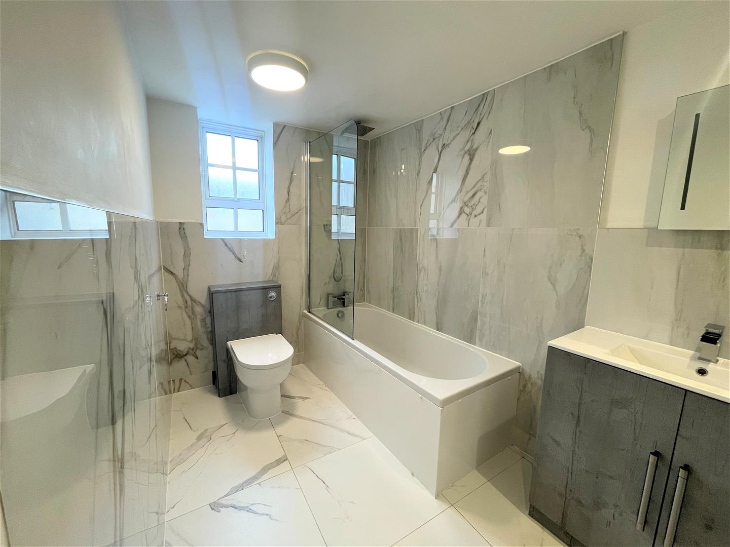 White bathroom suite with marble effect floor and wall tiles, additionally full length bath with shower attachment, w.c. hand wash basin with stainless steel mixer tap, part tiled floor and walls, extractor fan, stainless steel heated towel rail, mirror.