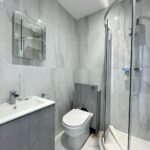Shower suite comprising corner shower, w.c. hand wash basin with stainless steel mixer tap, part tiled floor and walls, extractor fan, radiator.