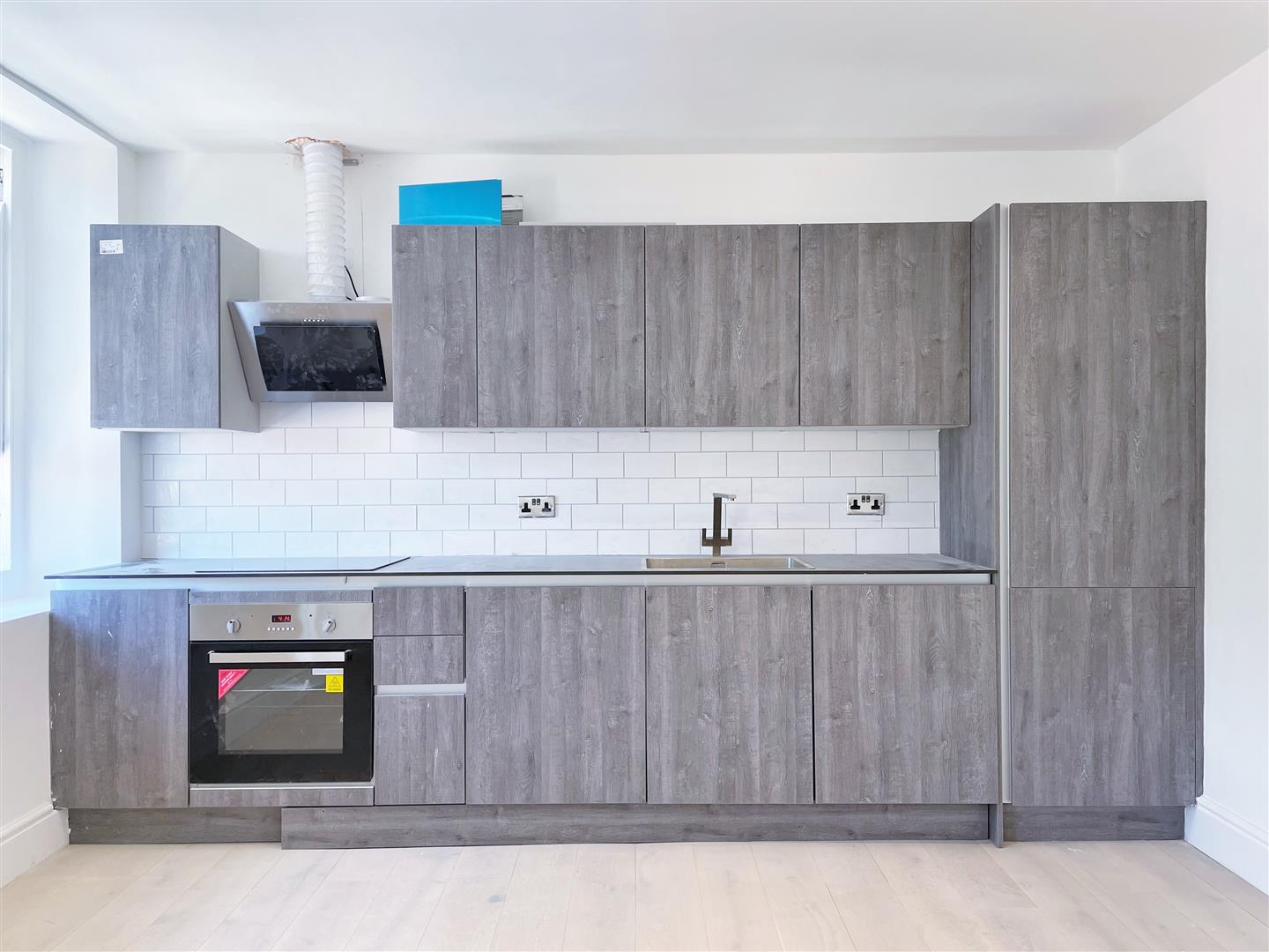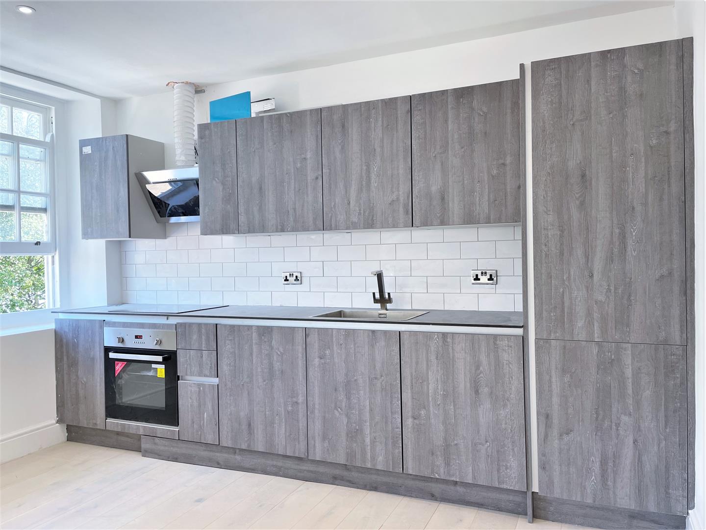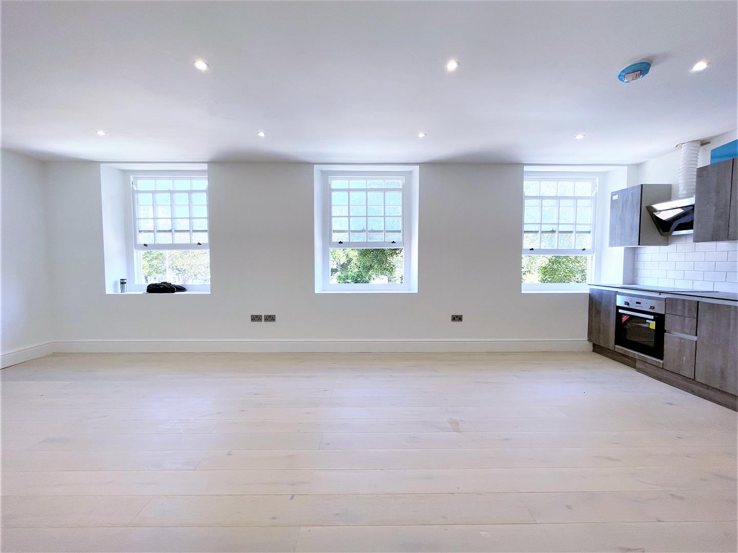 Open plan kitchen living room with integrated kitchen appliances including fridge freezer, washing machine, oven and hob, stainless steel sink and bowl drainer. Hardwood flooring, LED ceiling down lighters, TV aerial point, double glazed Easterly aspect window, radiator.