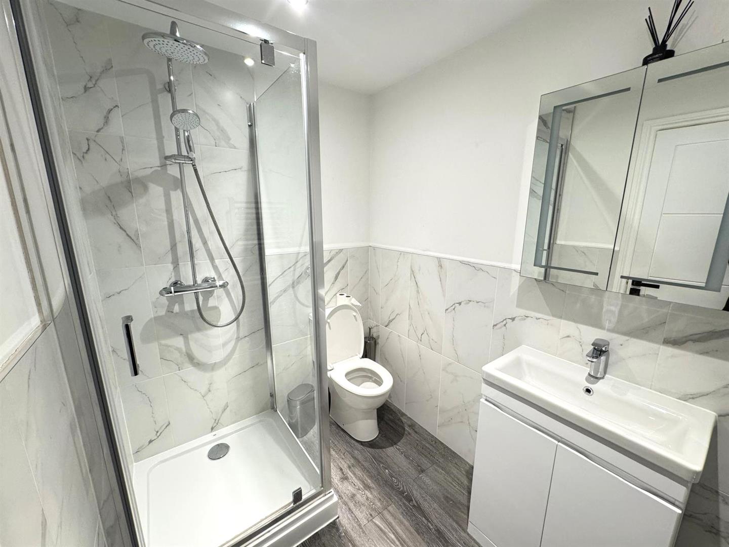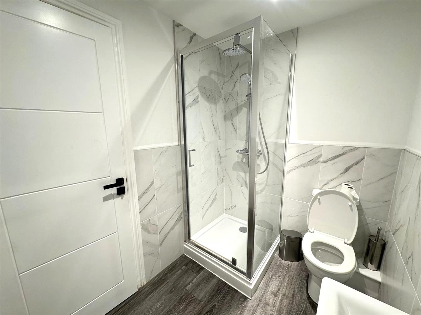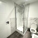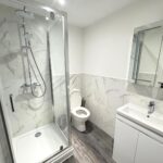 Modern white bathroom suite with shower attachment, marble effect tiles, wc, hand wash basin, extractor fan.