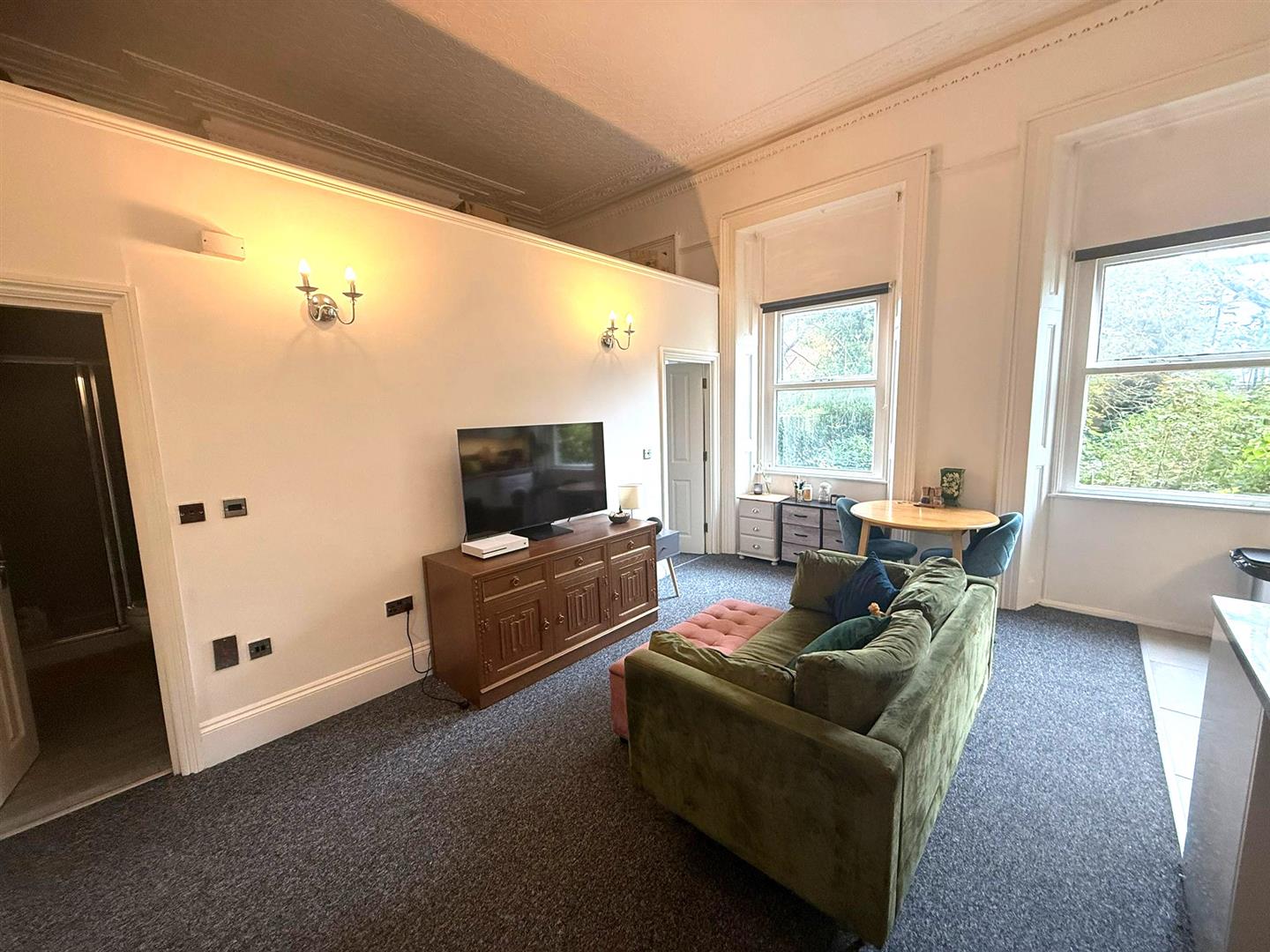Living room area: carpet throughout, tv aerial point, radiator, door entry telephone system, ceiling downlighter, window.