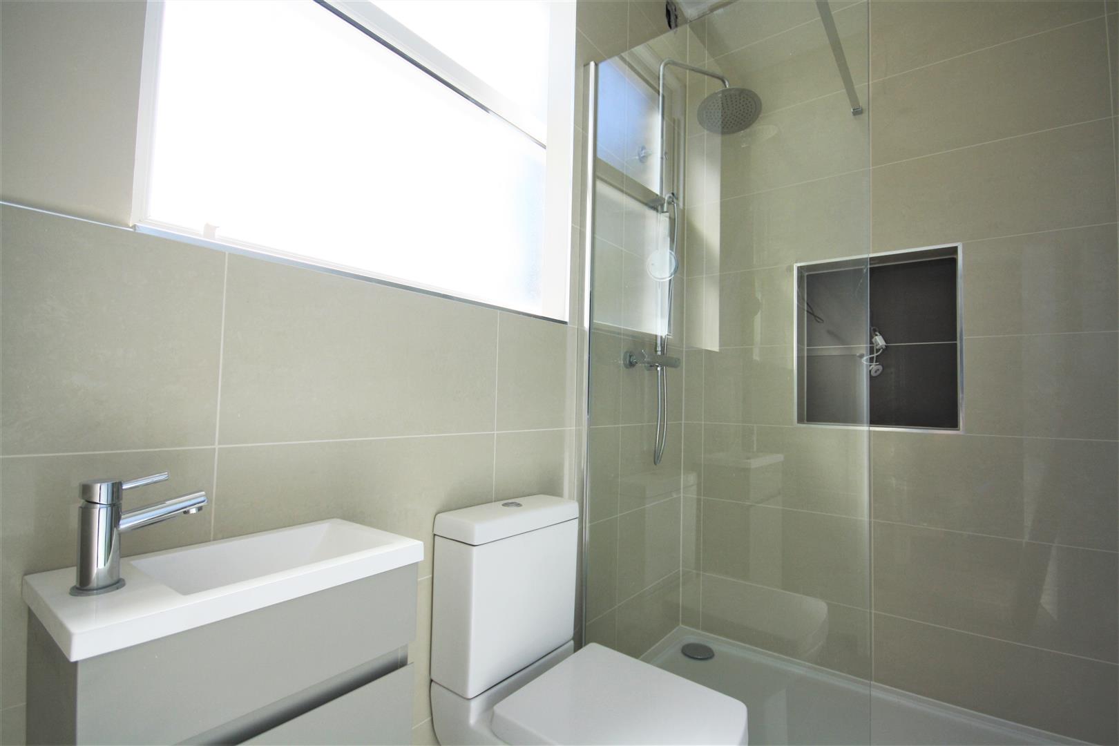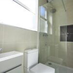 Modern white shower suite with shower attachment, wc, hand wash basin, storage beneath, heater towel rail, extractor fan and light mirrored cabinet.