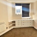 Double bedroom with carpet flooring, ceiling downlighters, north easterly aspect sash window, shelfing, radiator.