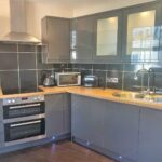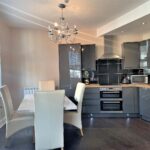 Kitchen area: Low and high level grey gloss units with integrated fridge/freezer, washer/dryer, dishwasher, stainless steel sink and bowl drainer. Electric hob with oven beneath, extractor fan above. Part tiled walls, ceiling downlighters.