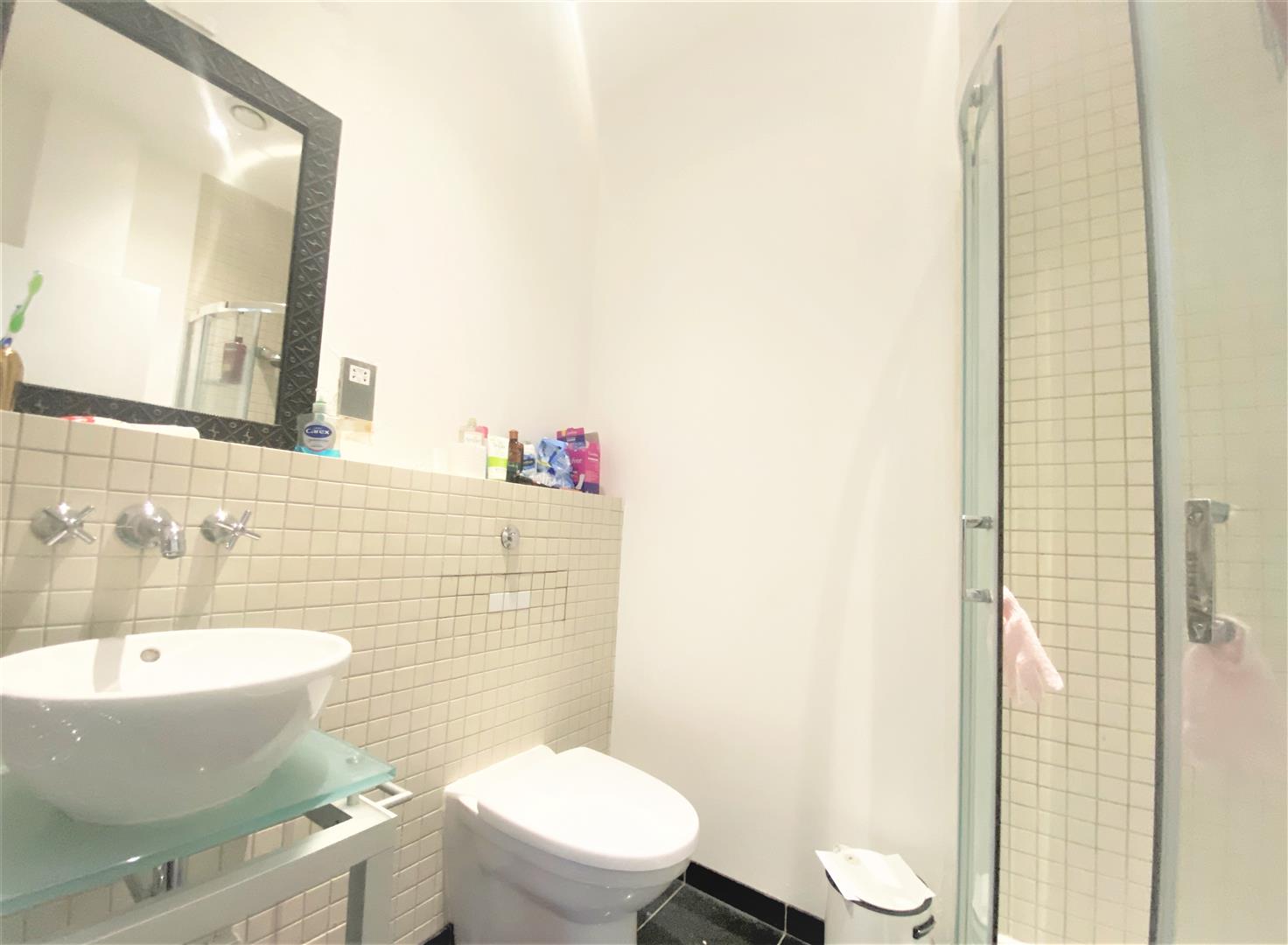Contemporary fully fitted shower room comprising of deep ceramic circular wash hand basin inset to opaque glass vanity unit and chrome wall mounted mixer tap, low level close cover WC with button flush, slate tiled flooring, chrome wall mounted heated towel rail, fully tiled shower cubical with glass door with chrome trim and chrome wall mounted shower controls.