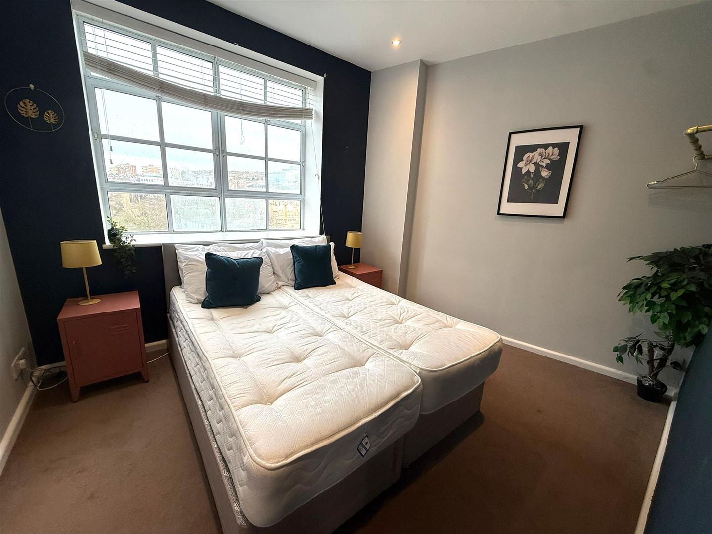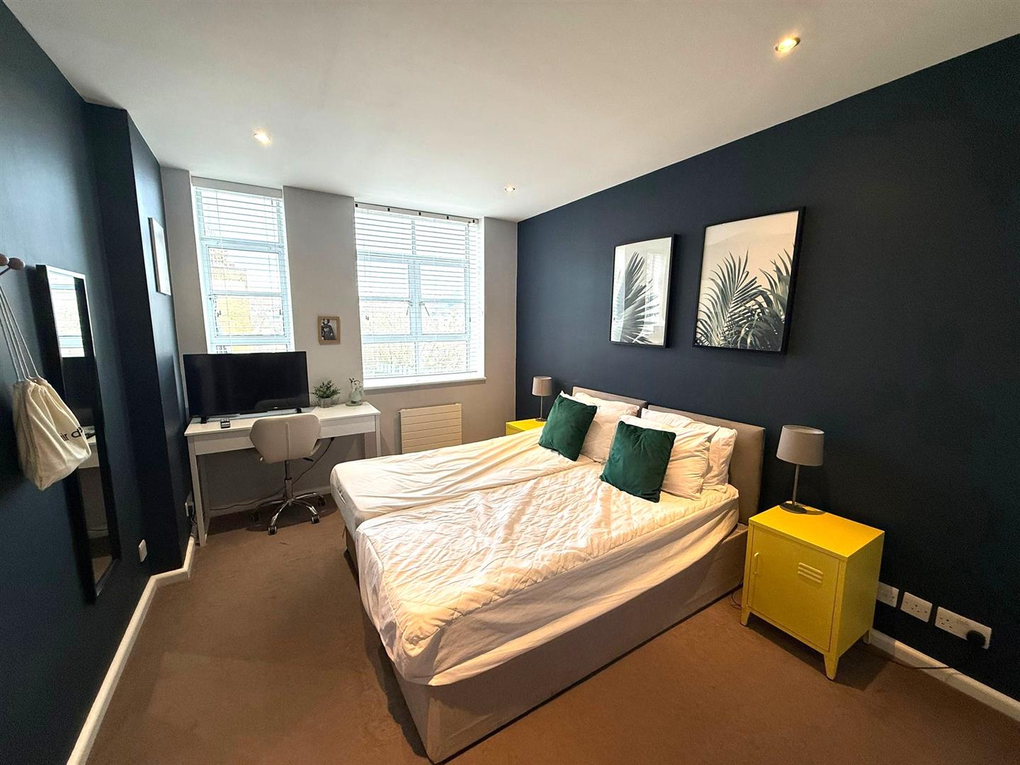Carpet flooring, large window with radiator under, ceiling downlighters, built in storage cupboard, TV aerial points,