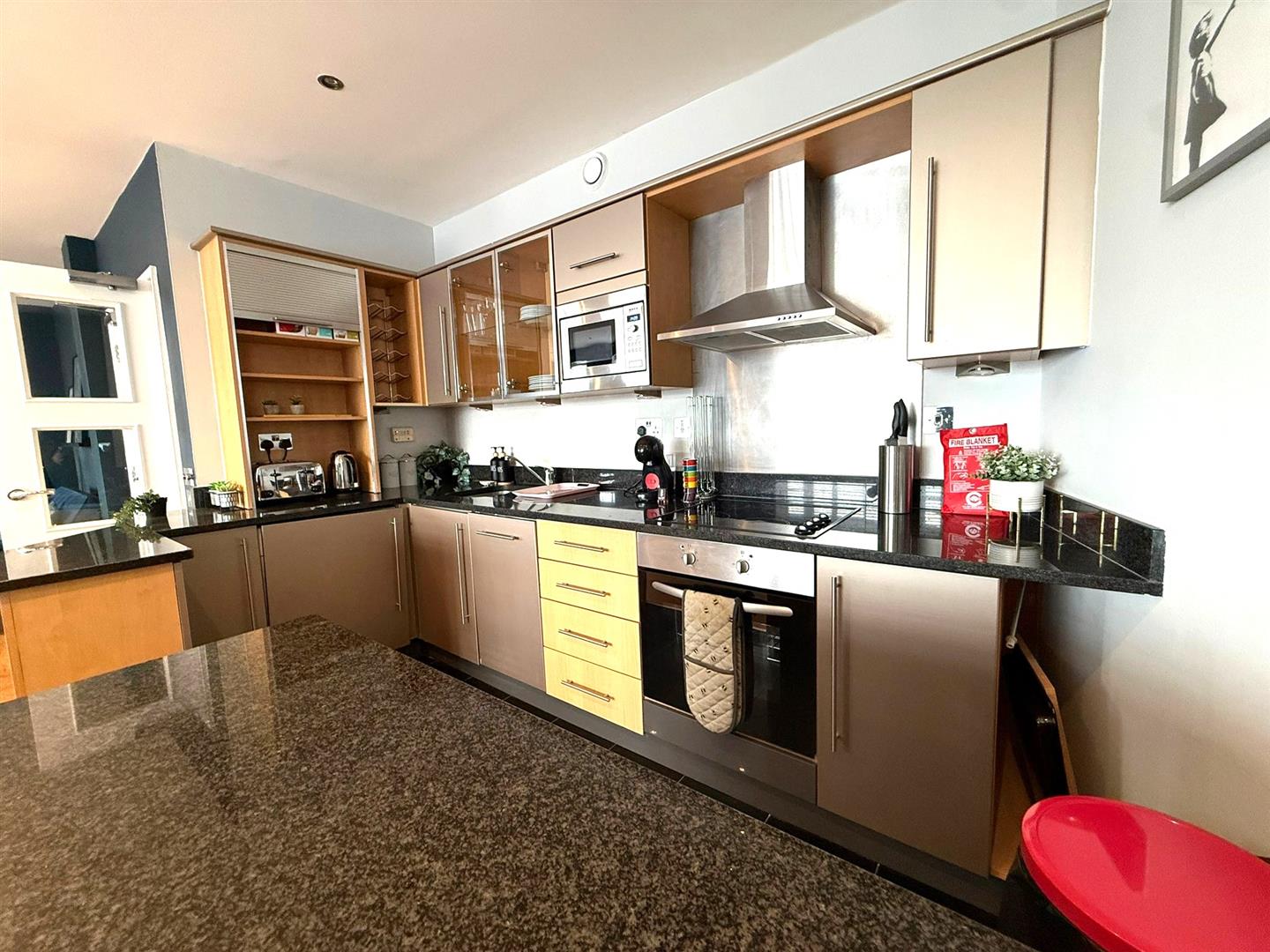 An impressive contemporary fully fitted kitchen which comprises of a stainless steel sink unit with chrome mixer tap and inset drainer with upright granite splash backs, four ring inset electric hob. Stainless steel fan assisted oven with brushed steel splash back and extractor fan above, range of fitted base and eye level units with matching display shelving. Integral appliances include a fridge/freezer, slim line dishwasher, washing machine and Siemens microwave. High gloss black granite tiled floor, inset ceiling spot lighting, breakfast bar with matching granite work surface.