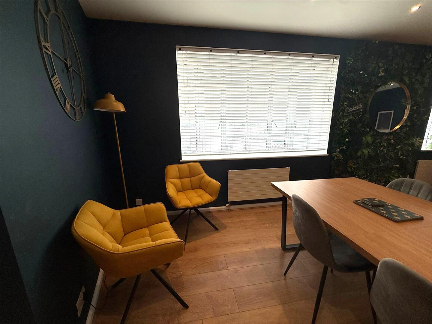 Double wooden French doors with glass insets and chrome handle opening to the open plan reception room. Two large double glazed multi pane windows, numerous inset chrome down lighters on dimmer switch, wood effect flooring, two flat panelled designer radiators, television and telephone points, open plan to the kitchen.