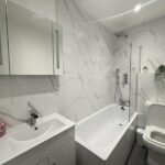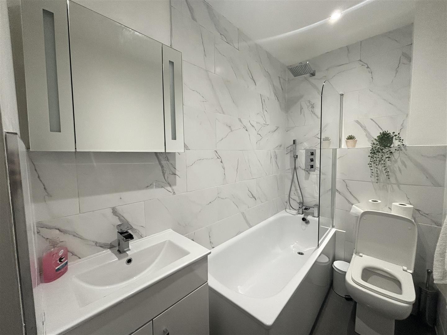 White bath suite comprising bath with shower attachment, W.C push flush, hand wash basin with stainless steel mixer tap, mirrored storage cabinet above, storage below. Marble effect tiled floor and wall, stainless steel heated towel rail, extractor fan, shaver point.